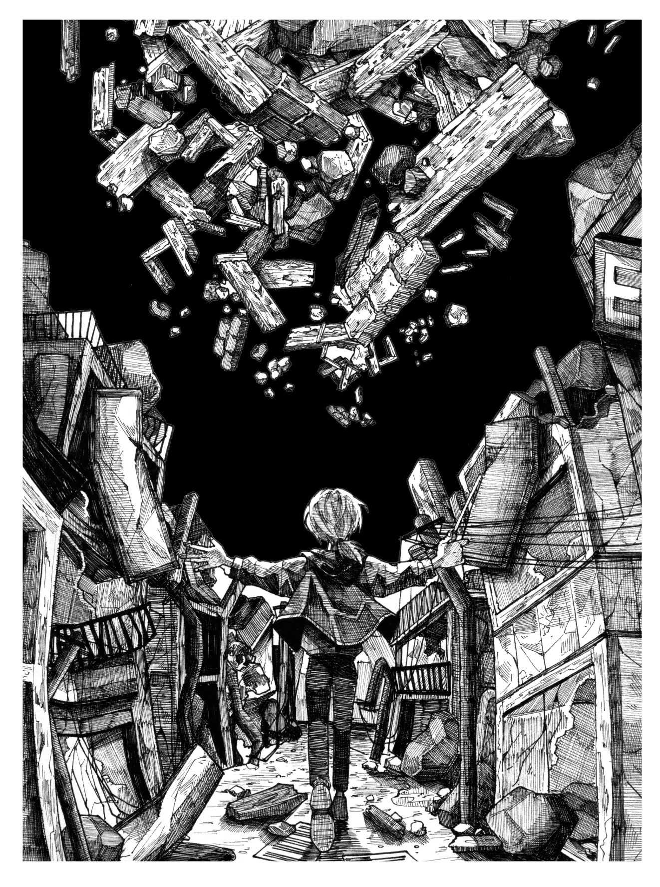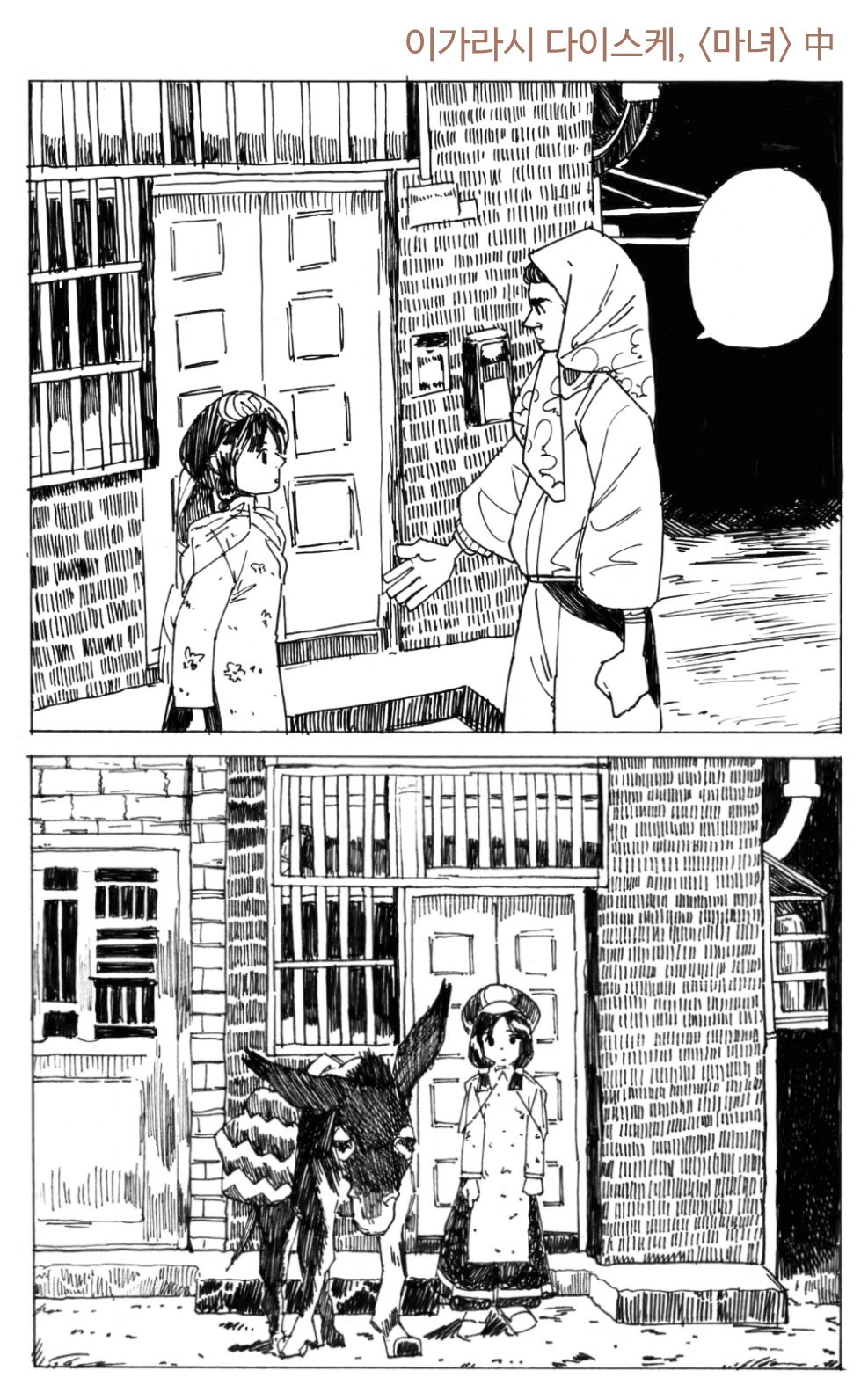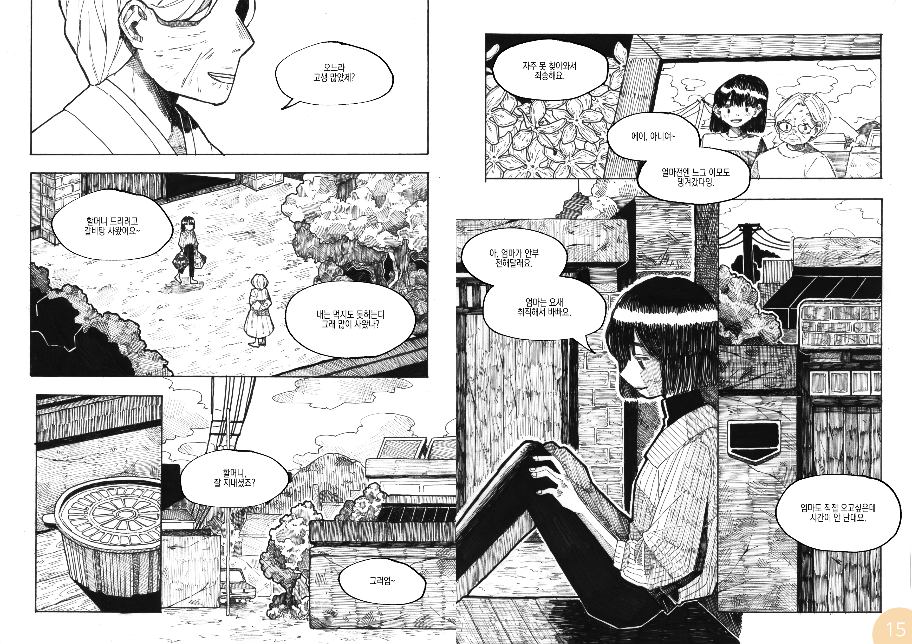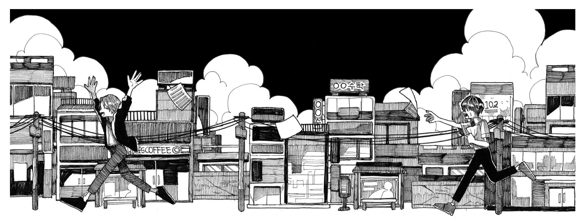 흑백만화에 펜 터치 강조.