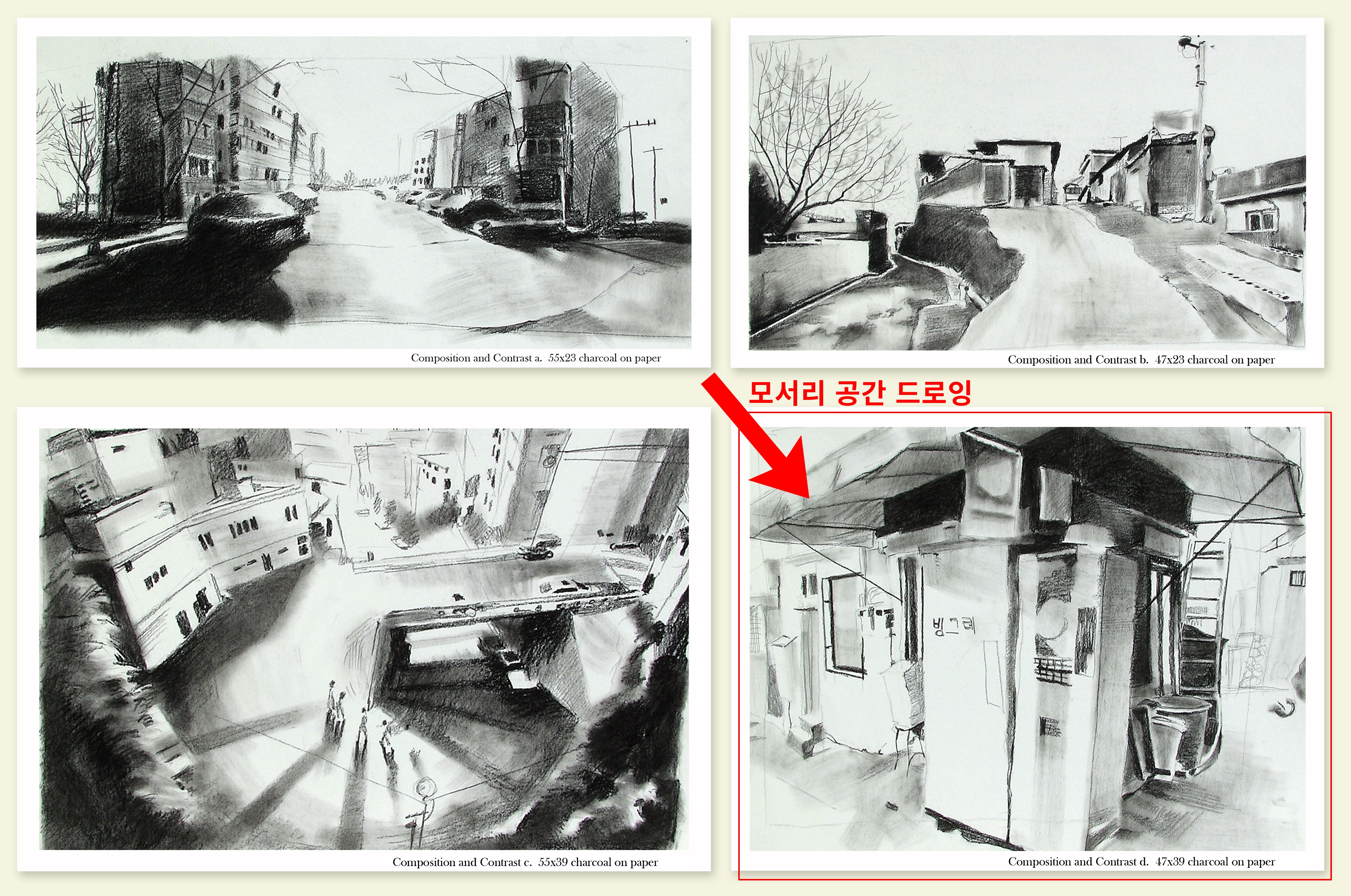 고민을 하던 중, 공간과 명암이 강조된 배경을 콘테를