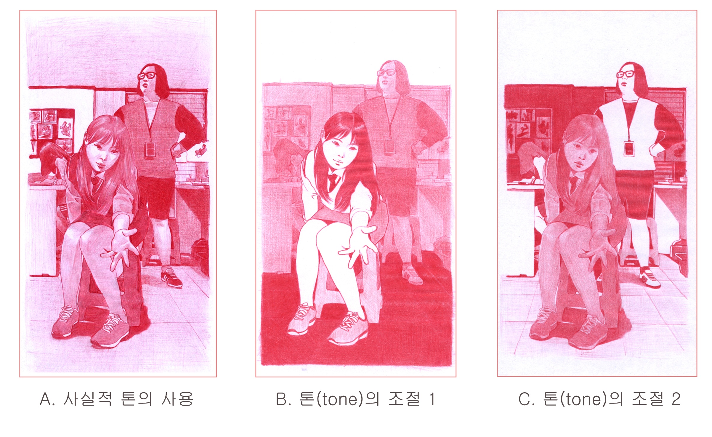 컬러 채색에서도 강-중-약의 조절로 그림의 분위기를