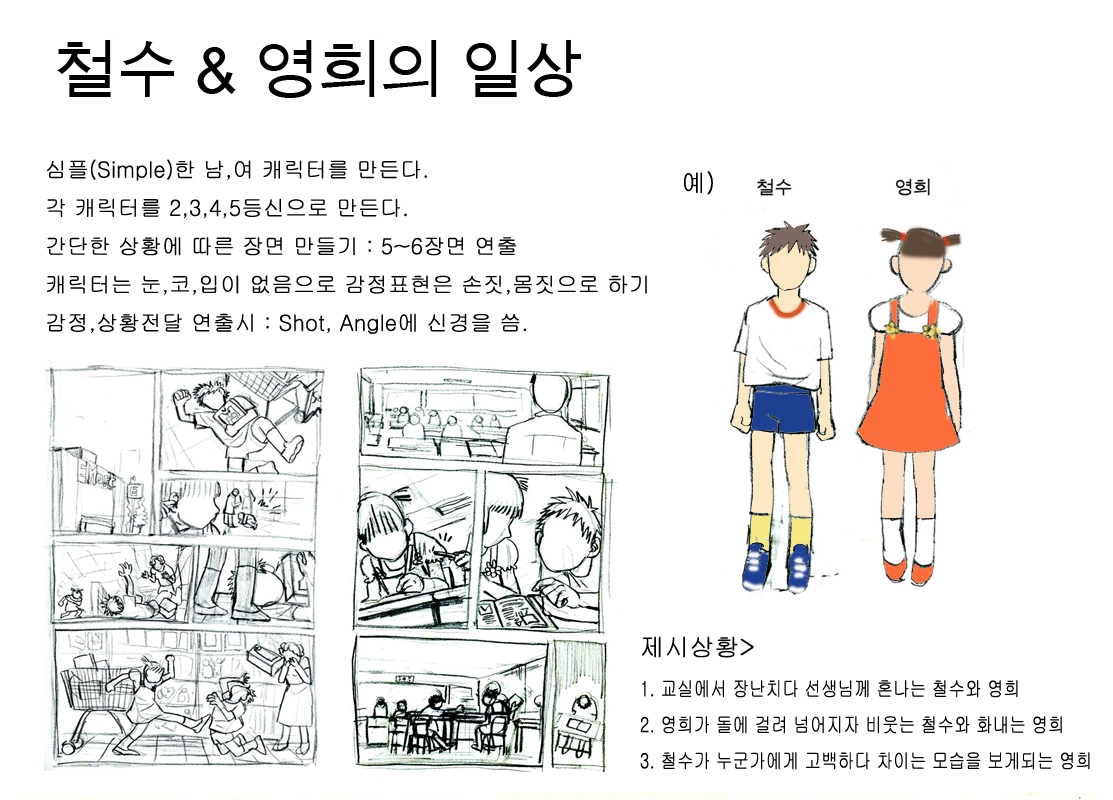 | Q: 만화에서 중요한 '대사' 와 '캐릭터의 눈코입'을 제외시킨다면...? | A: 만화적 연출로만 상황을 전달시켜야 한다 |